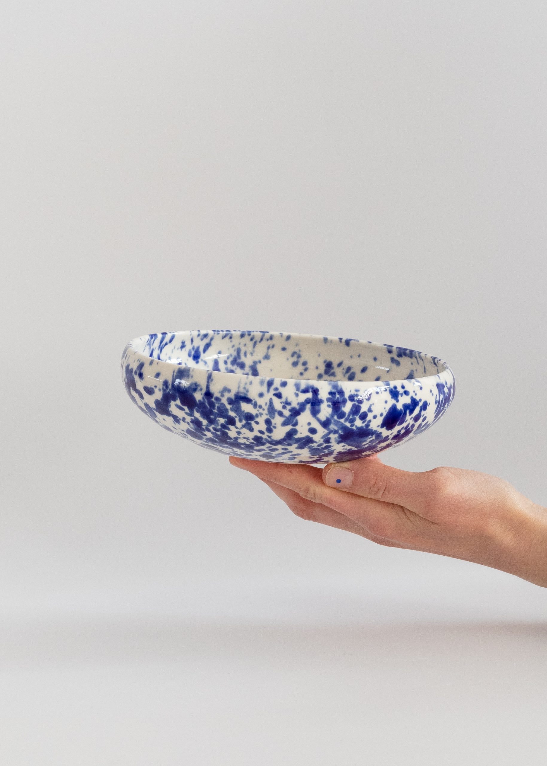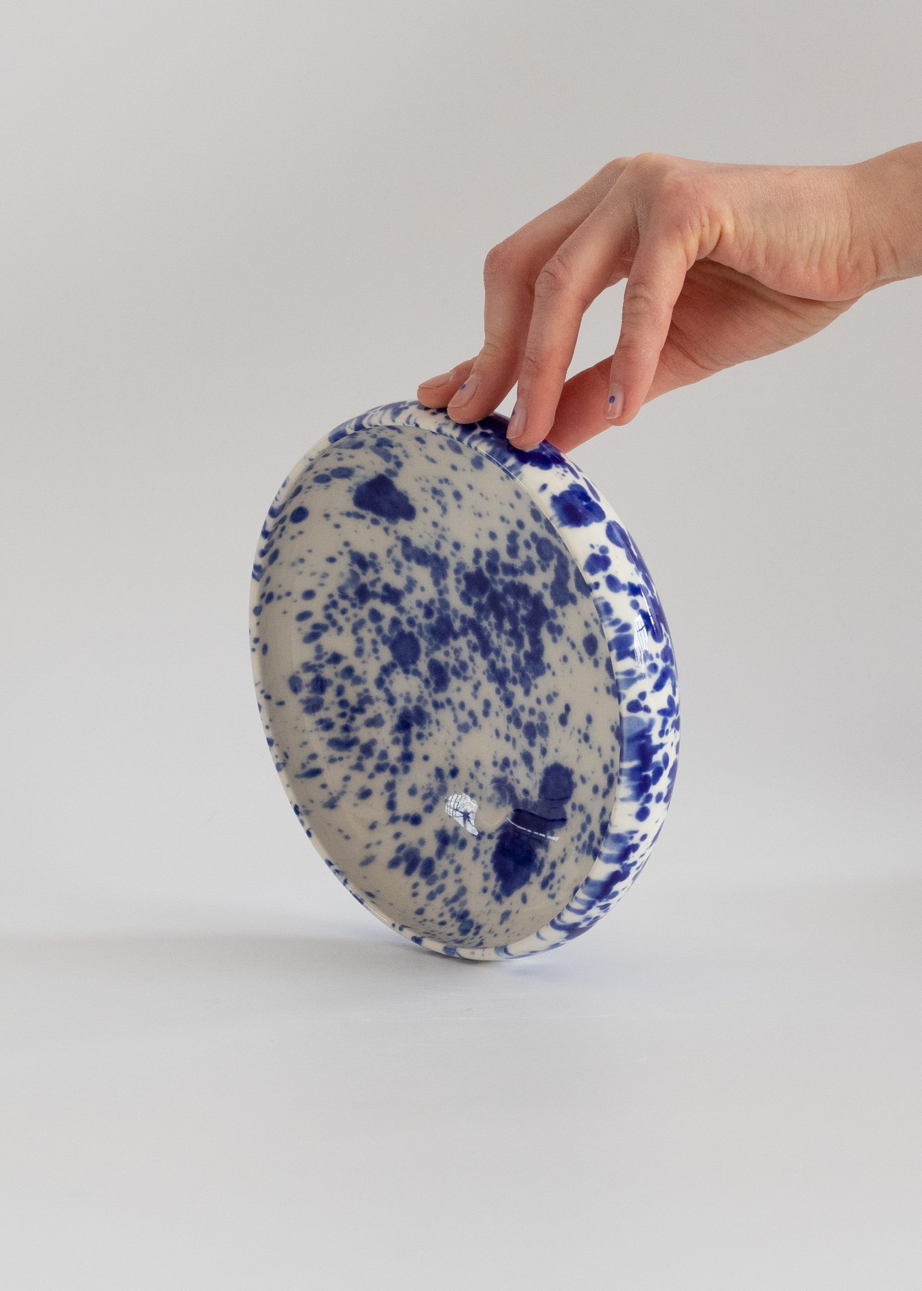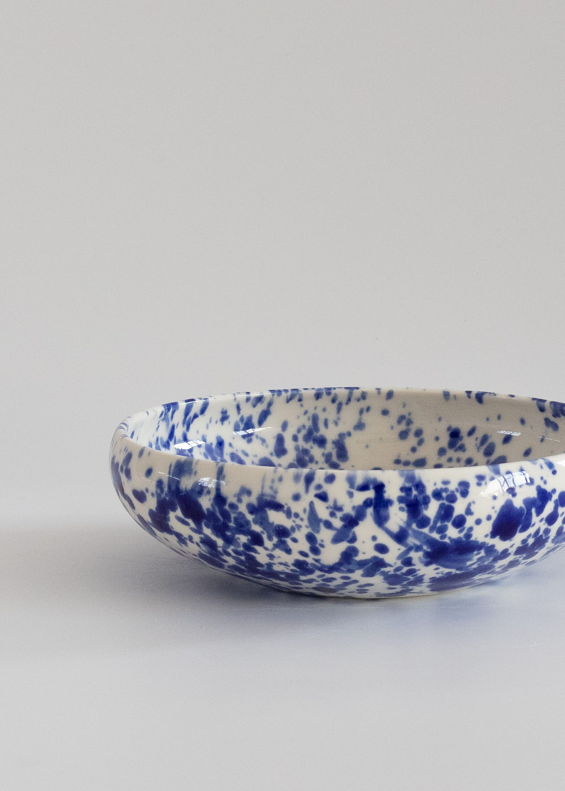White eye-catching porcelain bowl with cobalt splashes.