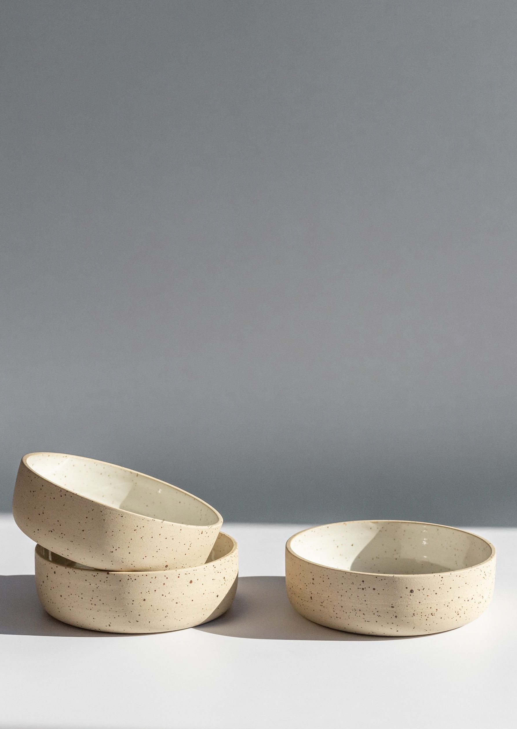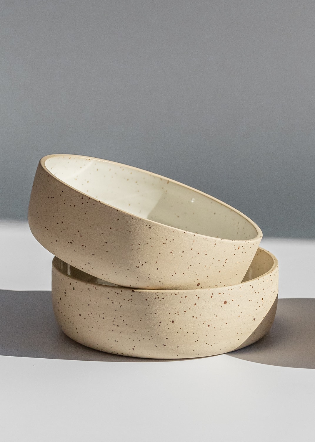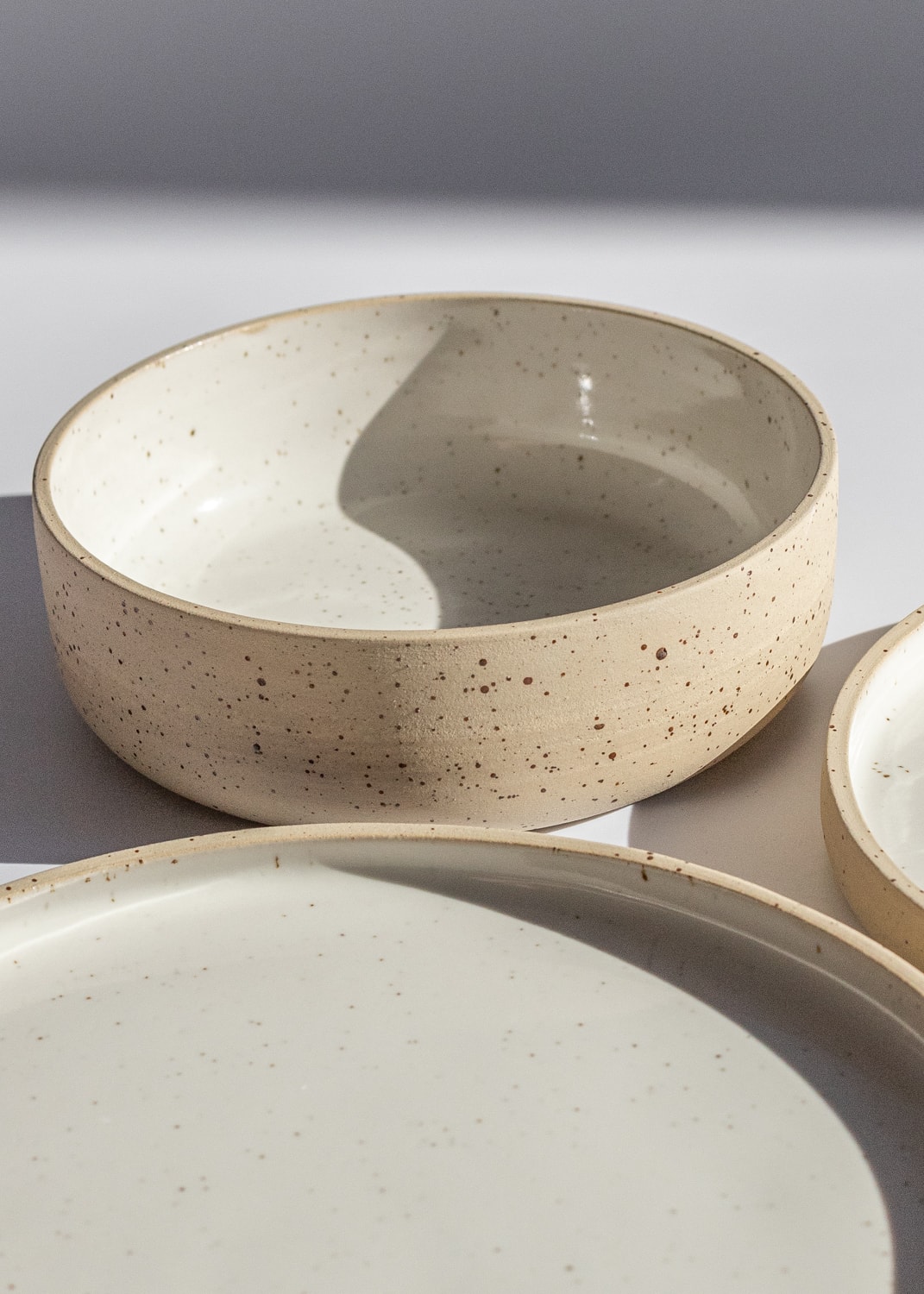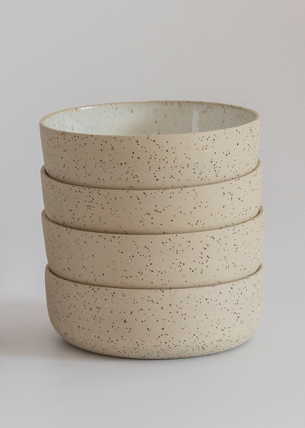 Stoneware bowl made of speckled clay. Inside covered with white glossy glaze.