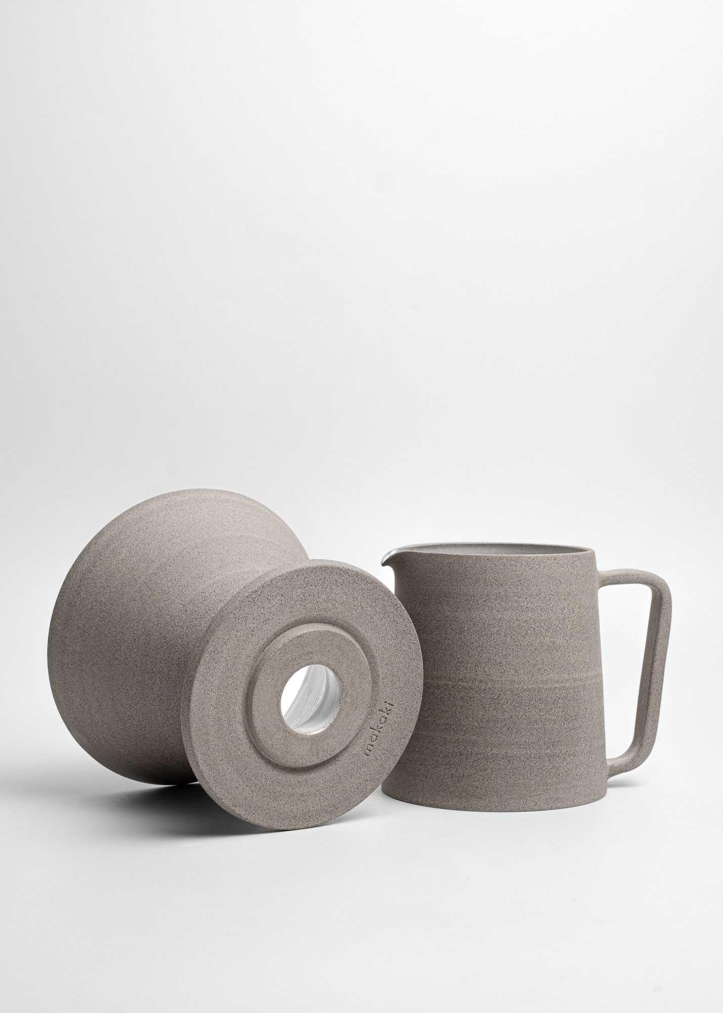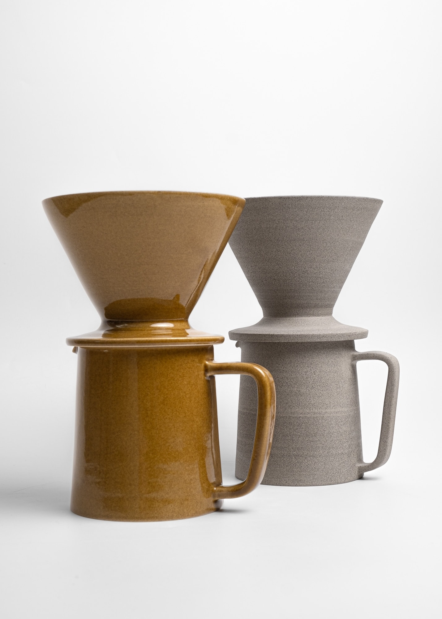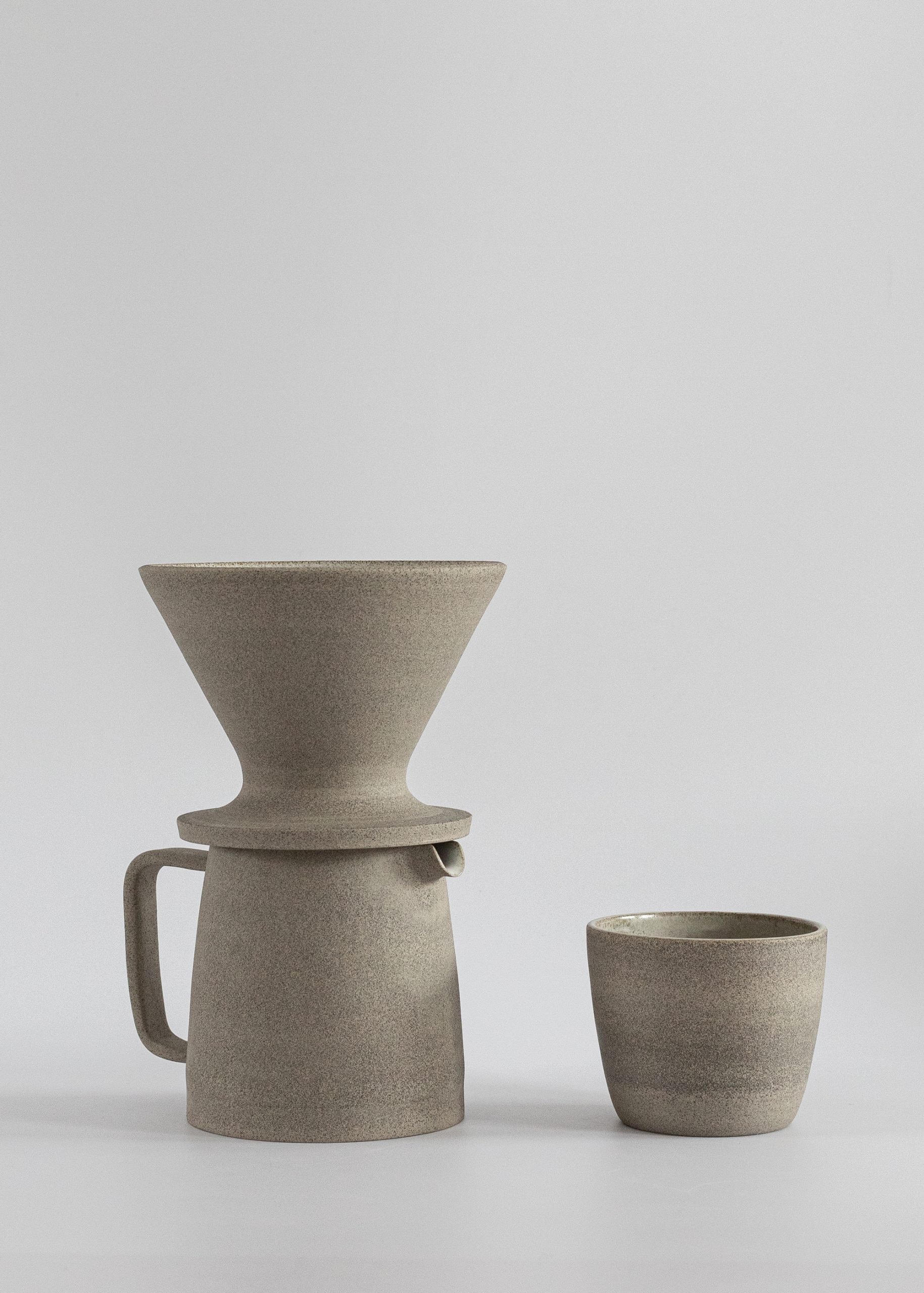 Minimal stoneware ceramic pour-over coffee kit made with grey clay. Semi-transparent white glossy glaze inside, rich unglazed texture outside (looks a bit like concrete).