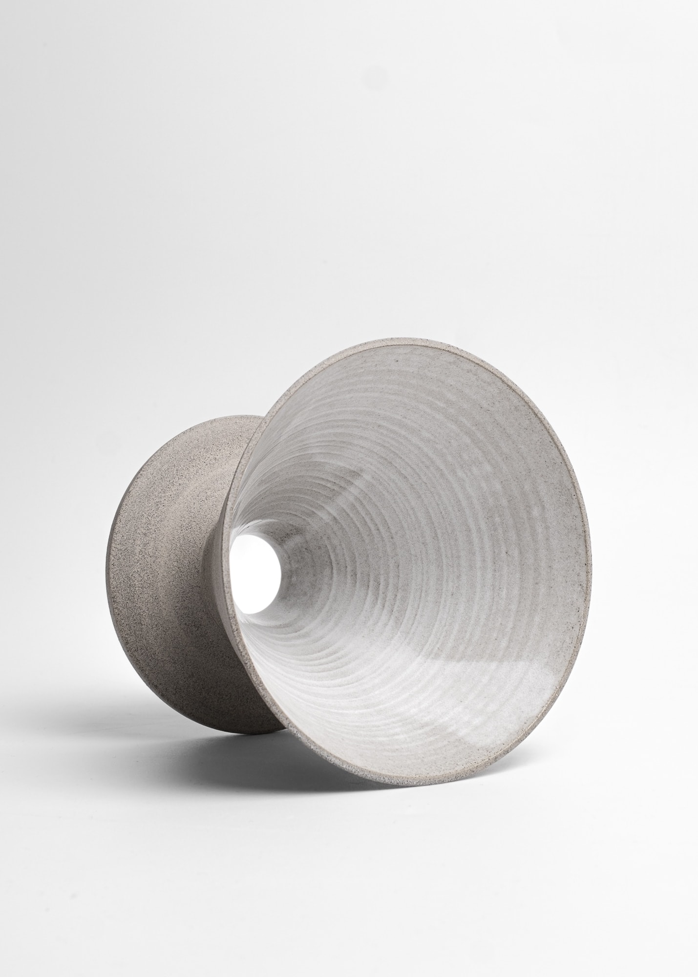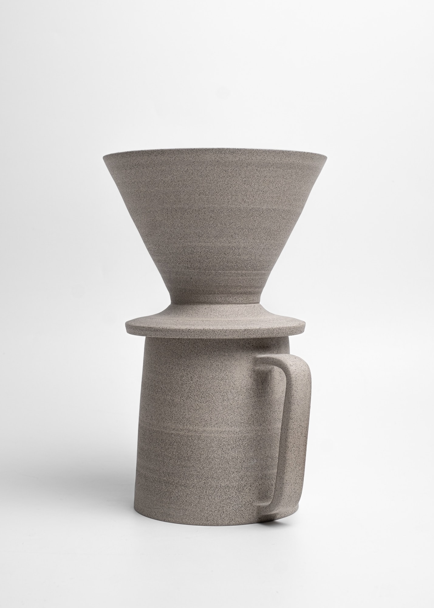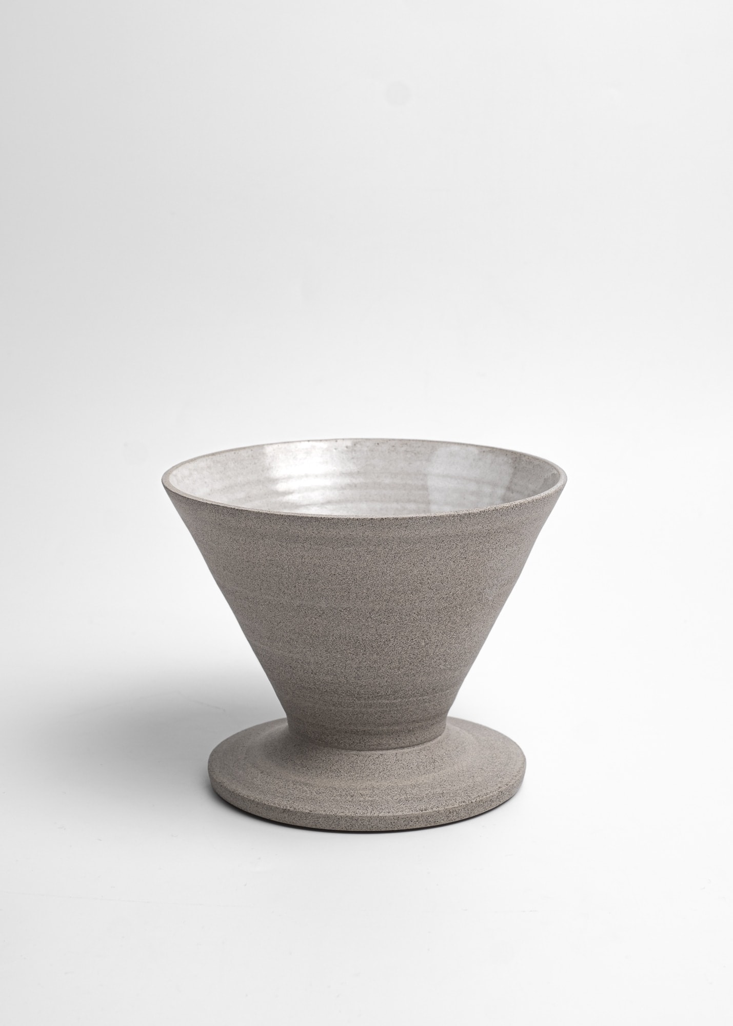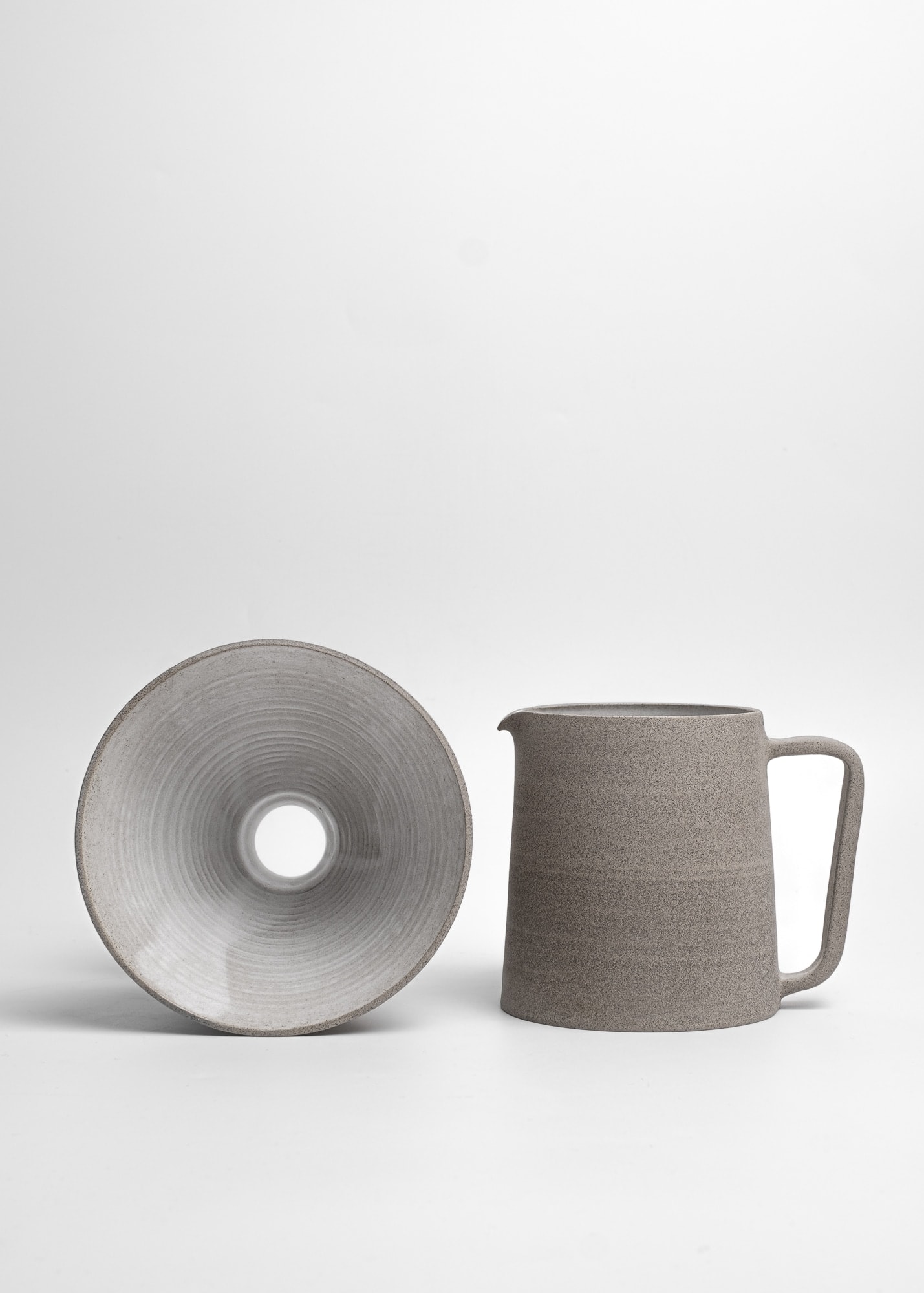 Minimal stoneware ceramic pour-over coffee kit made with grey clay. Semi-transparent white glossy glaze inside, rich unglazed texture outside (looks a bit like concrete).