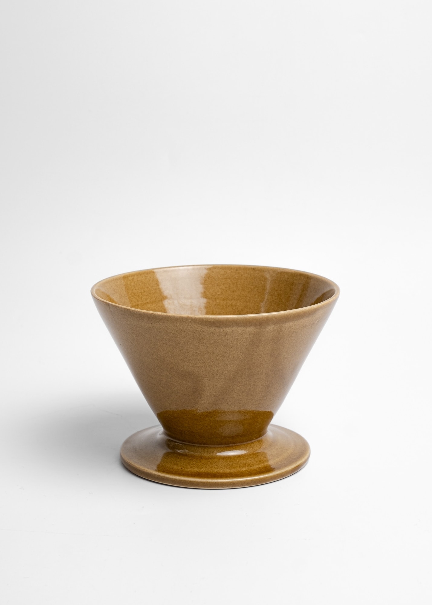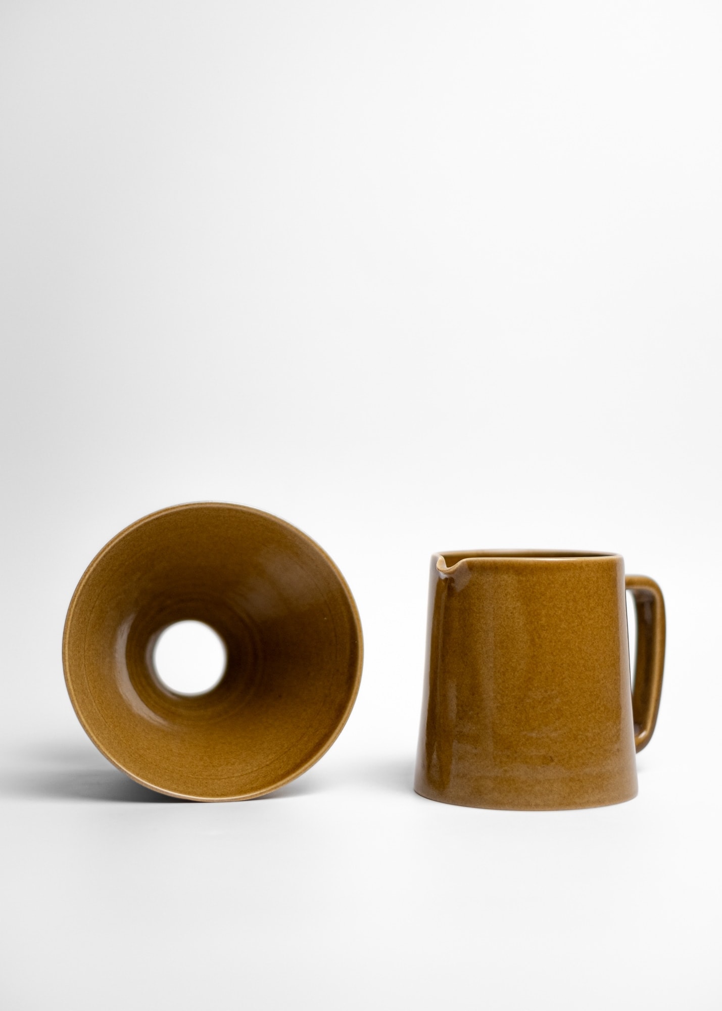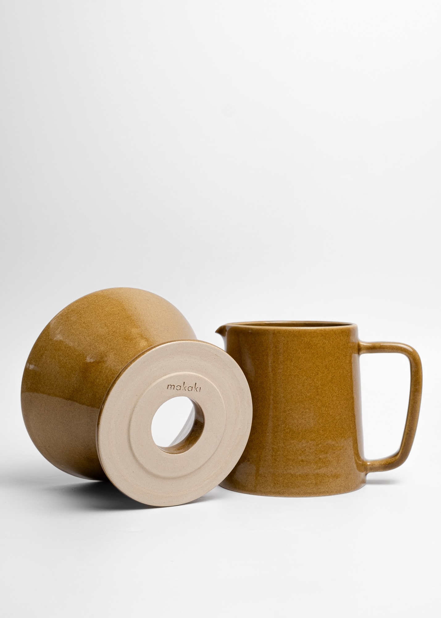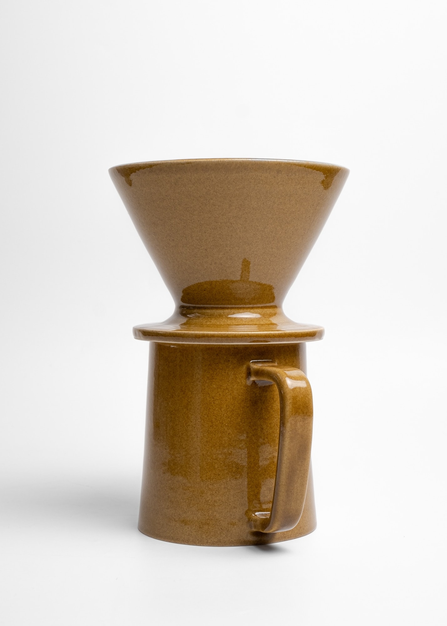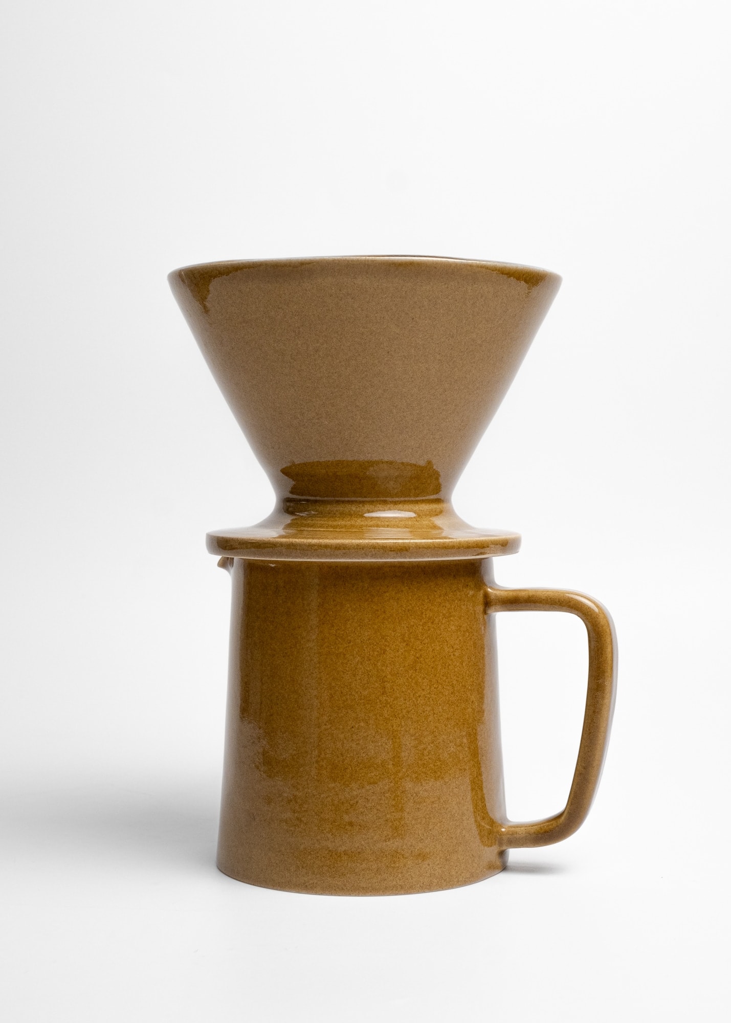 Mustard brown stoneware ceramic pour-over coffee kit.