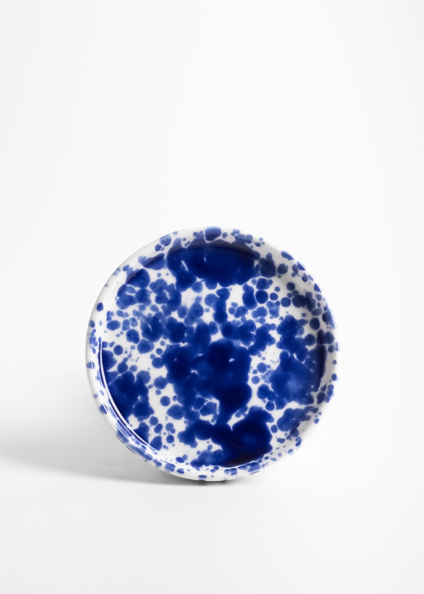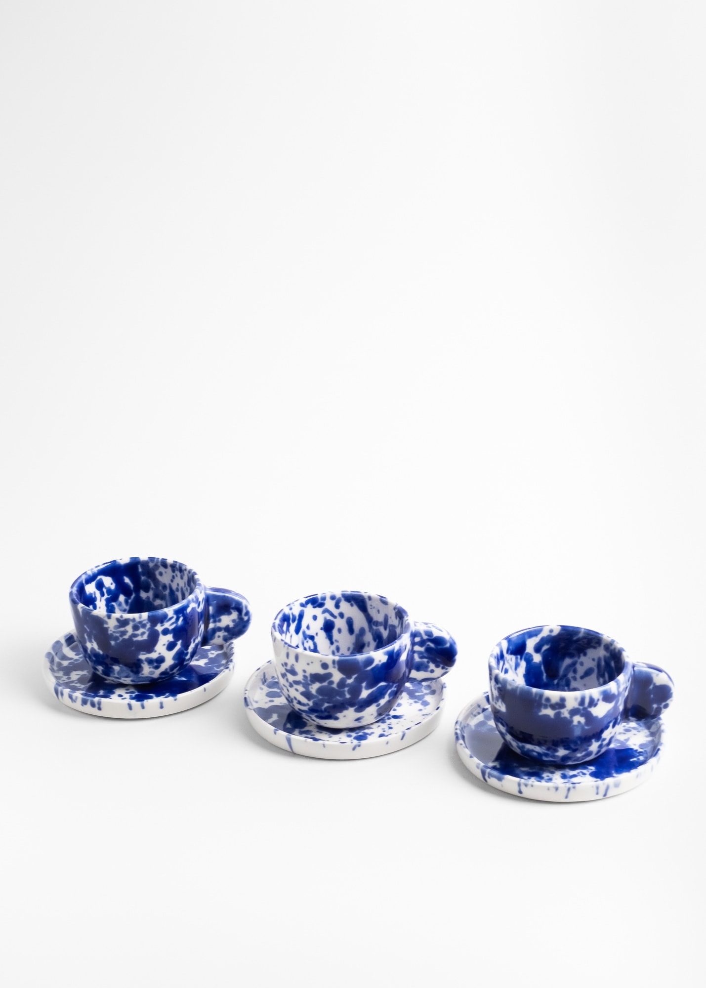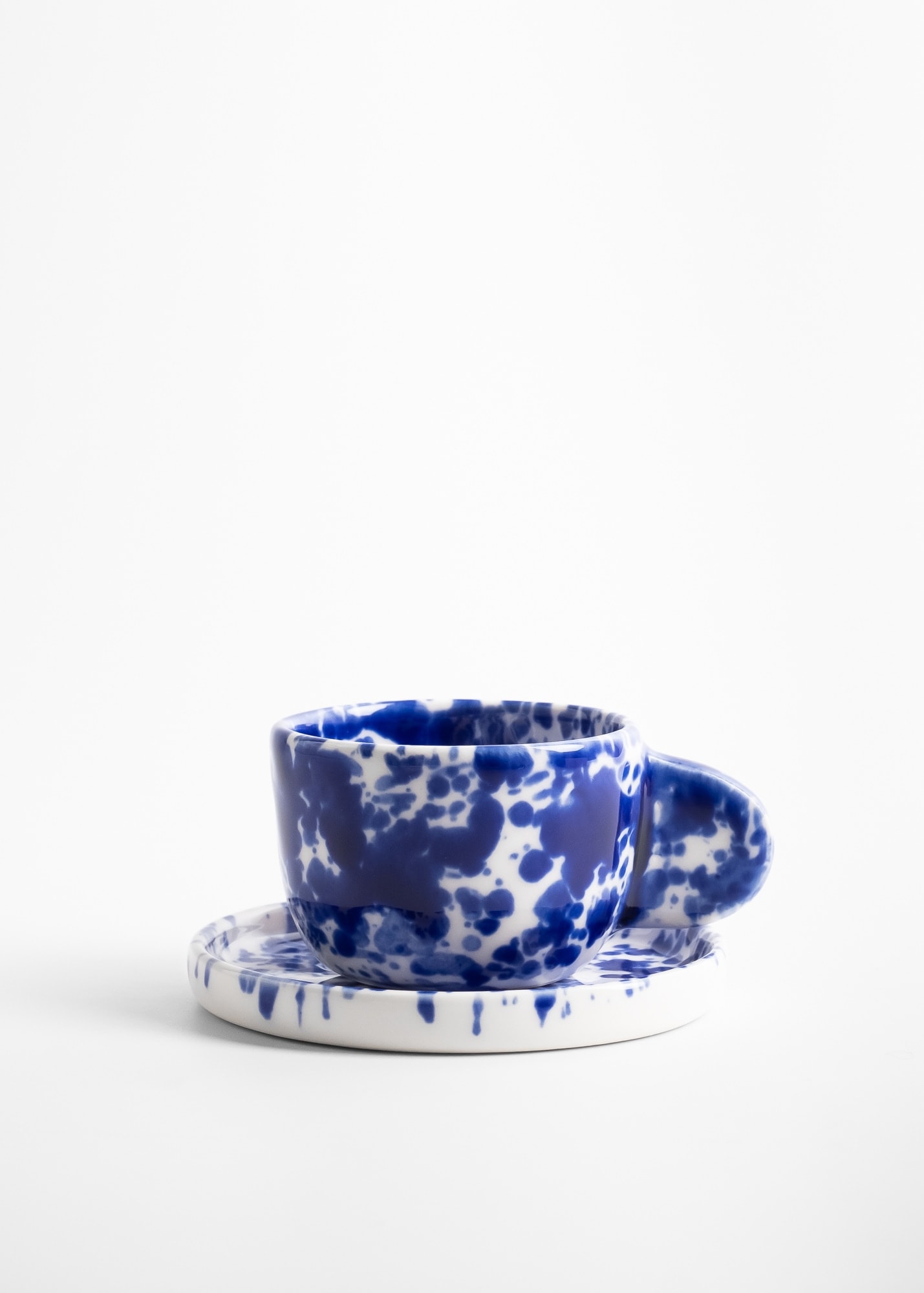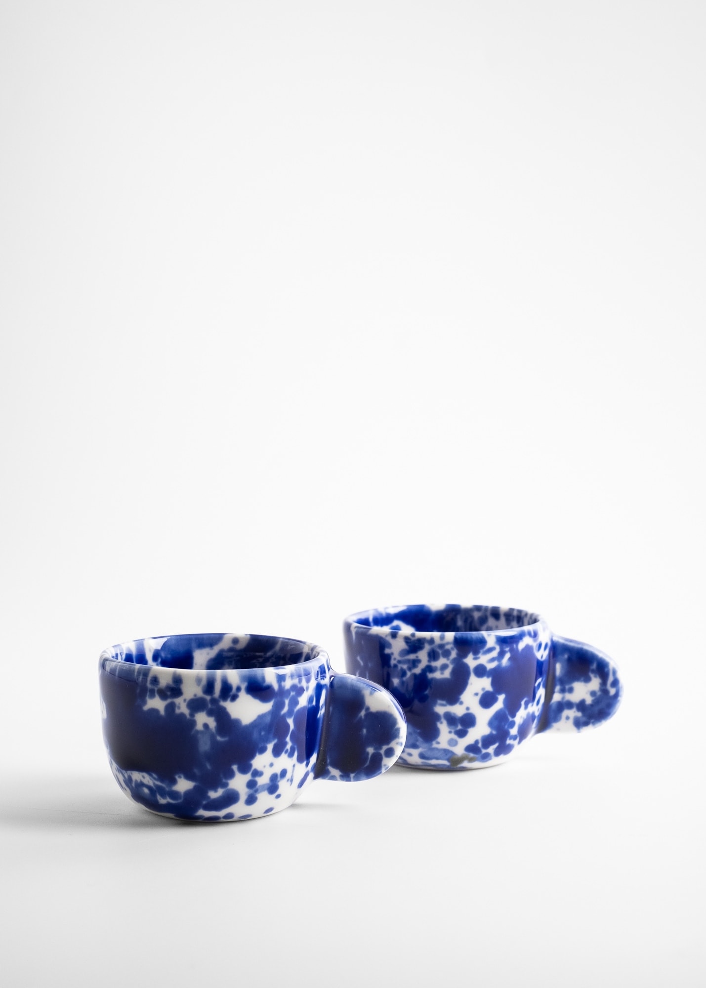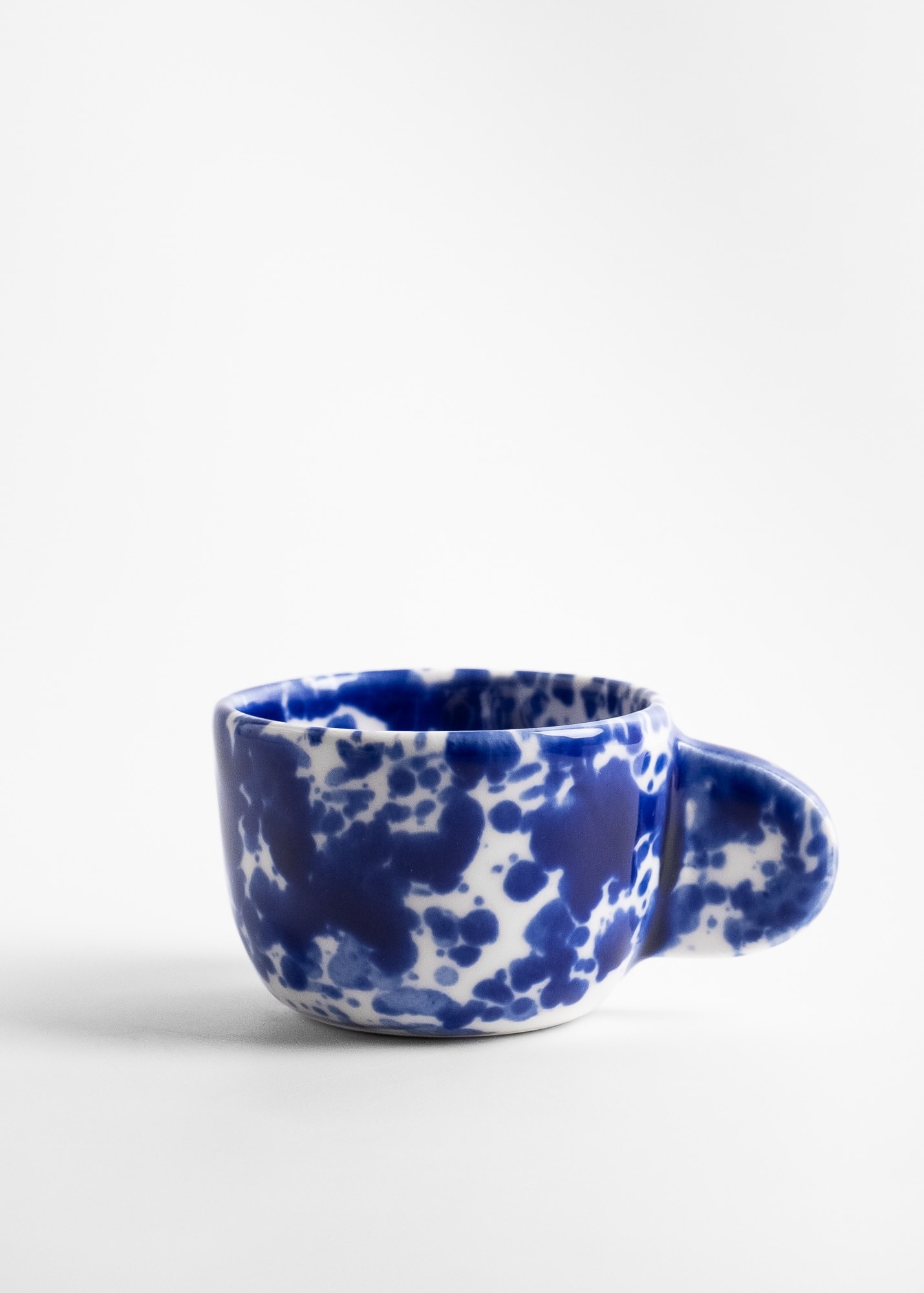 Cobalt splashes espresso cup with a simple handle, made with porcelain.
