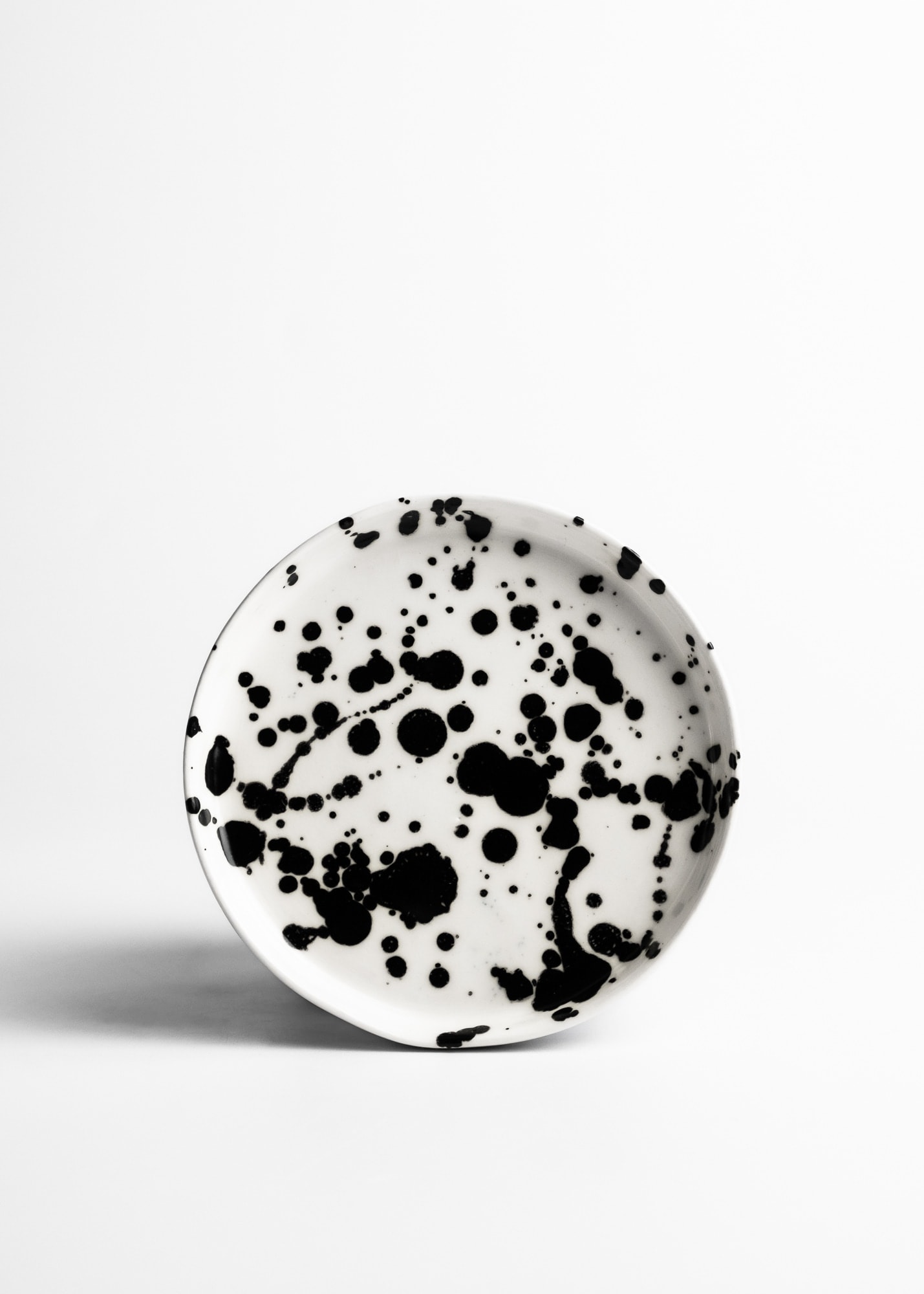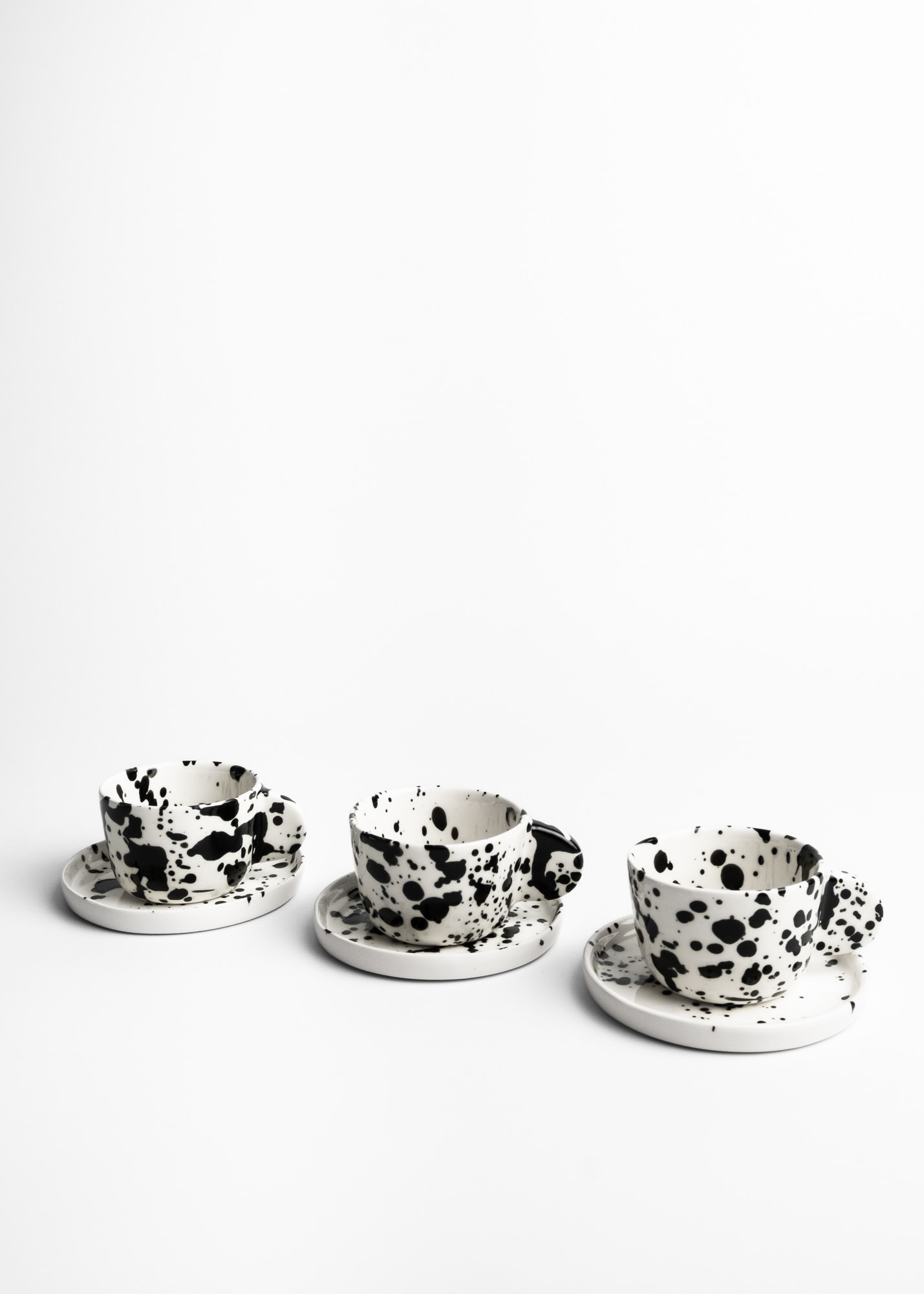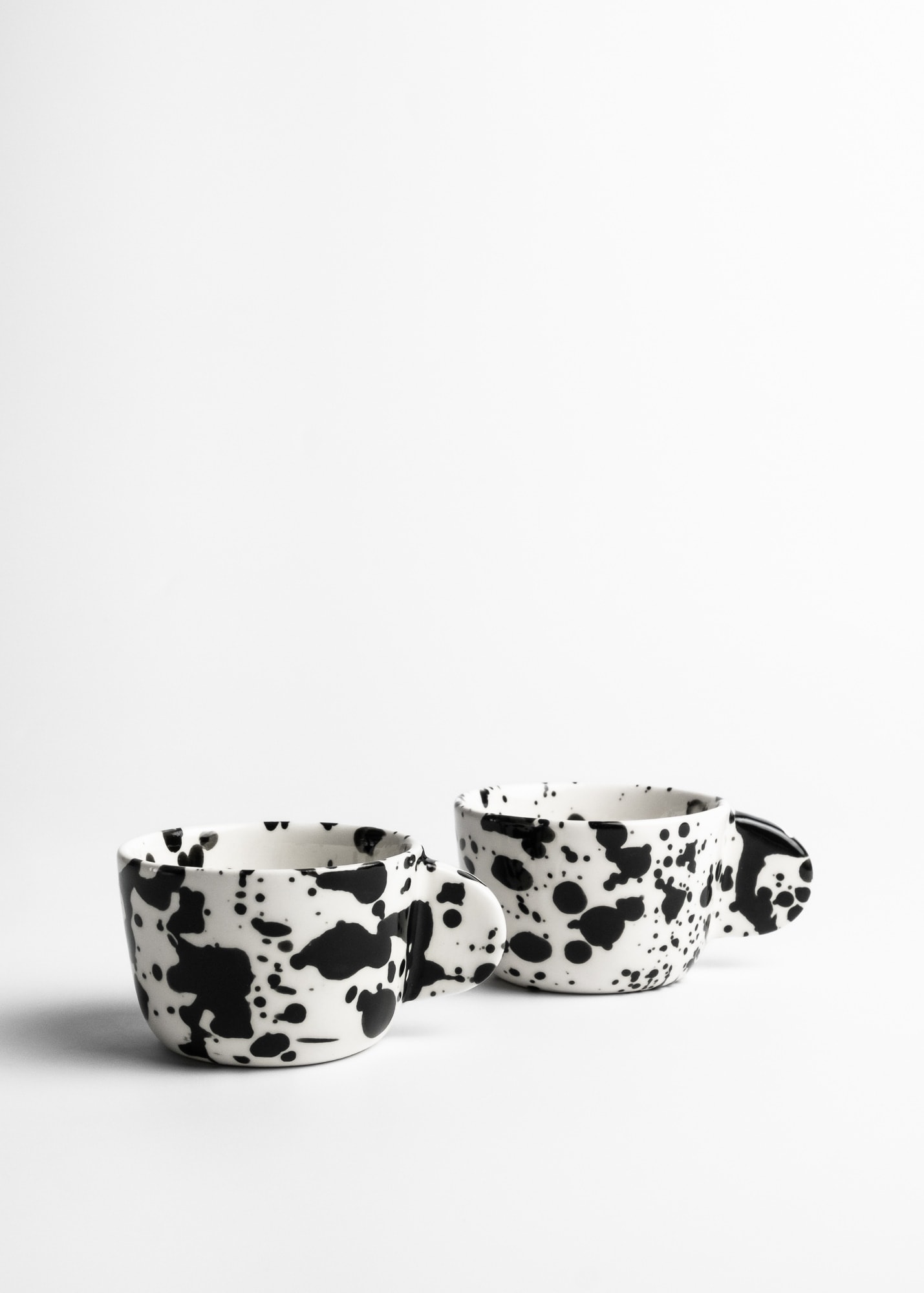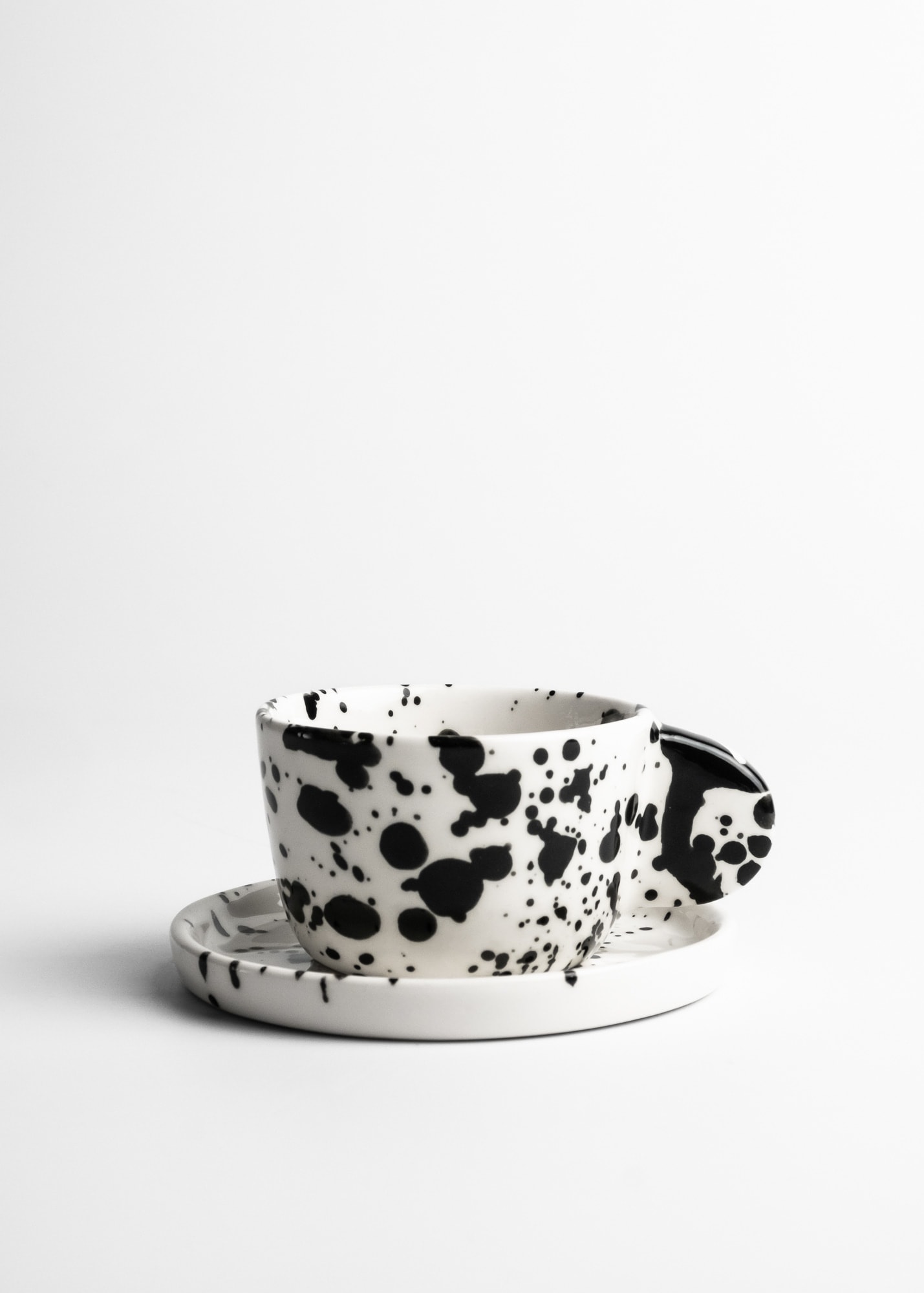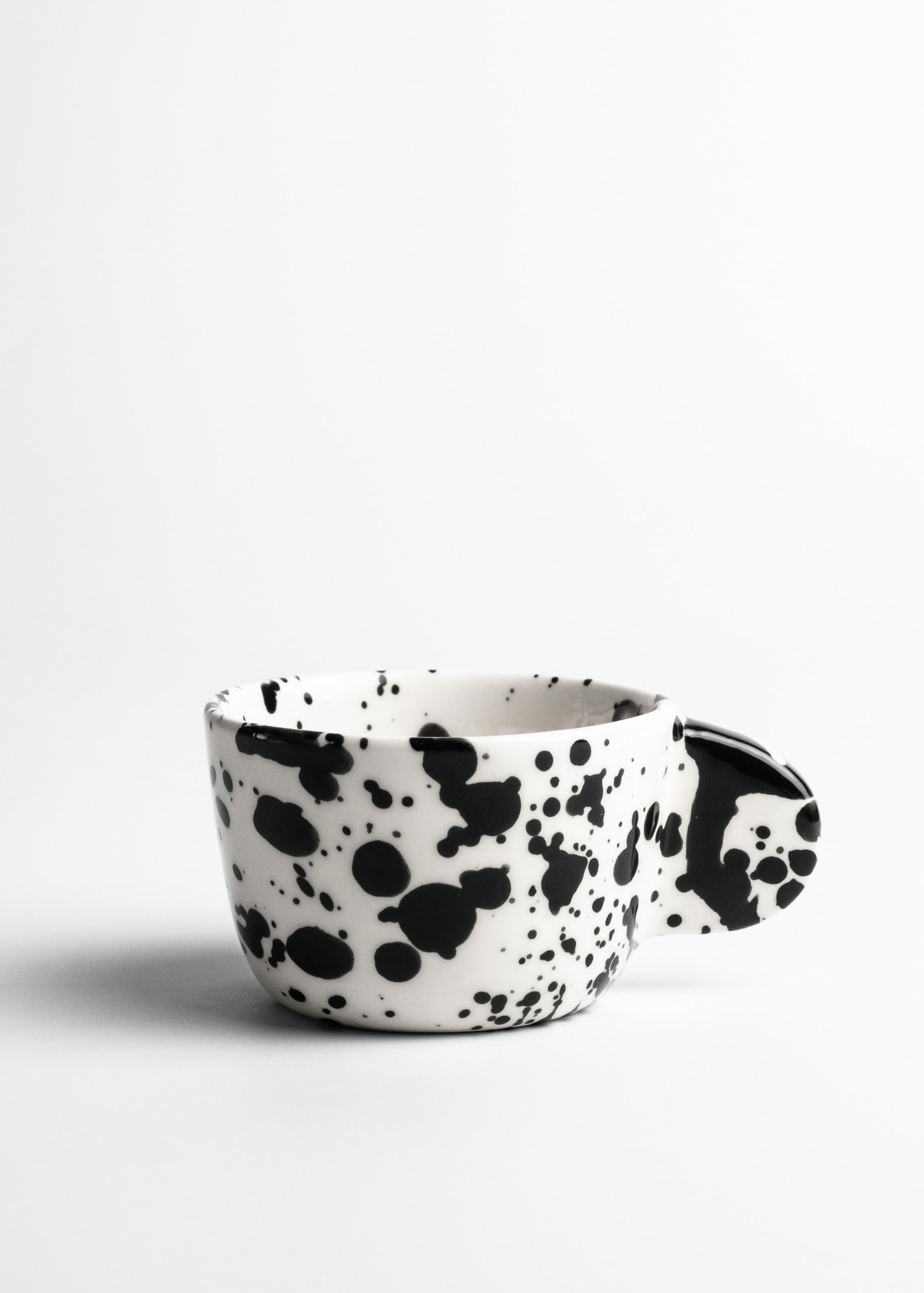 White espresso cup with black splashes inside and outside, with a simple handle, made with porcelain.