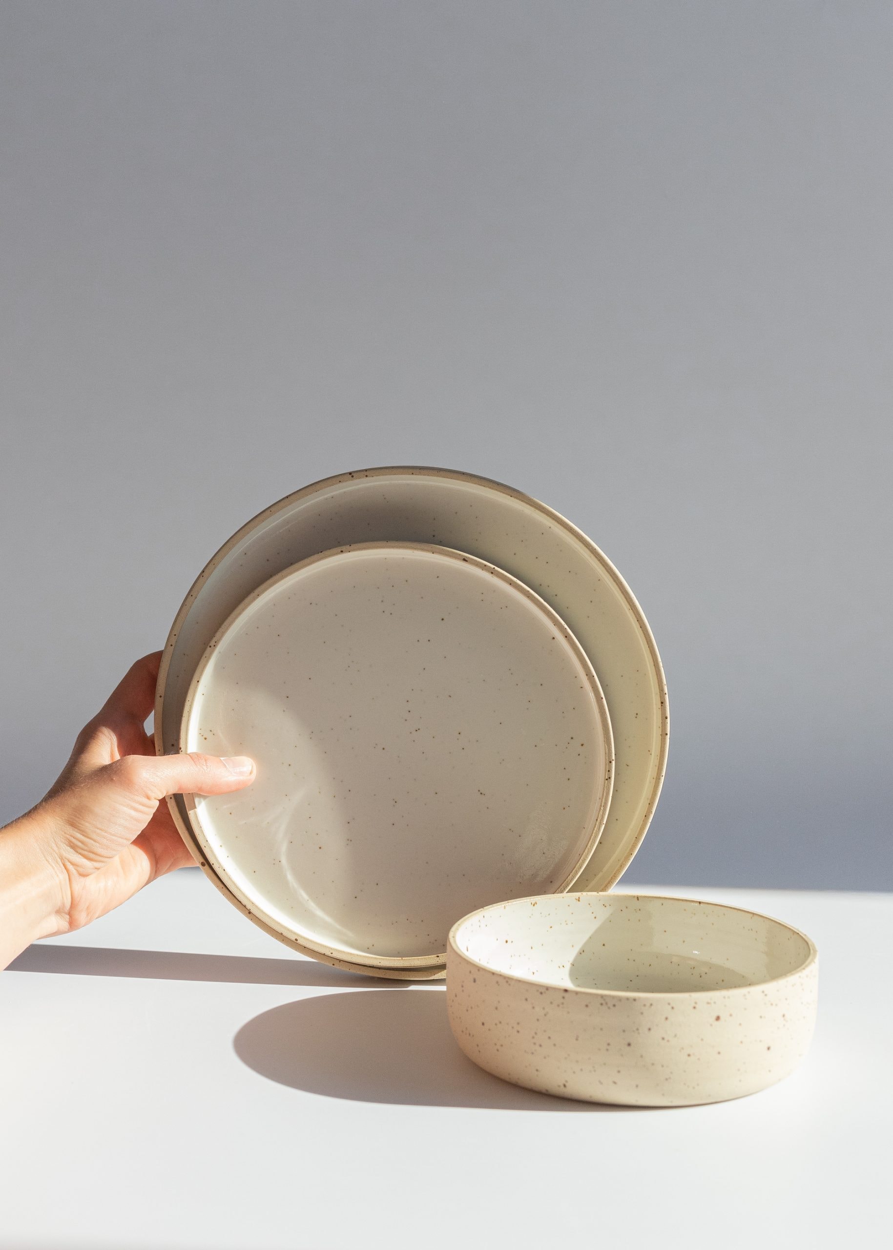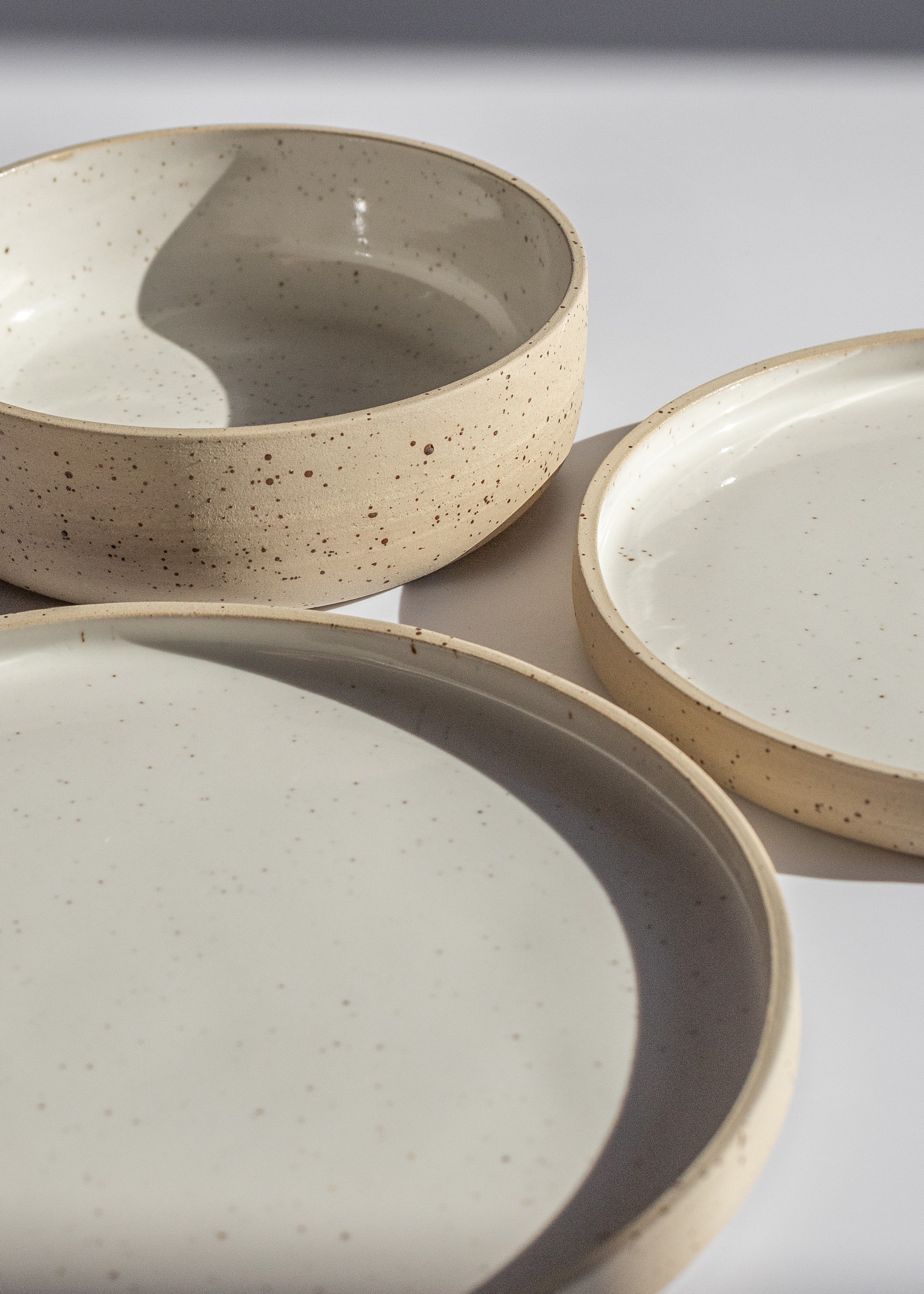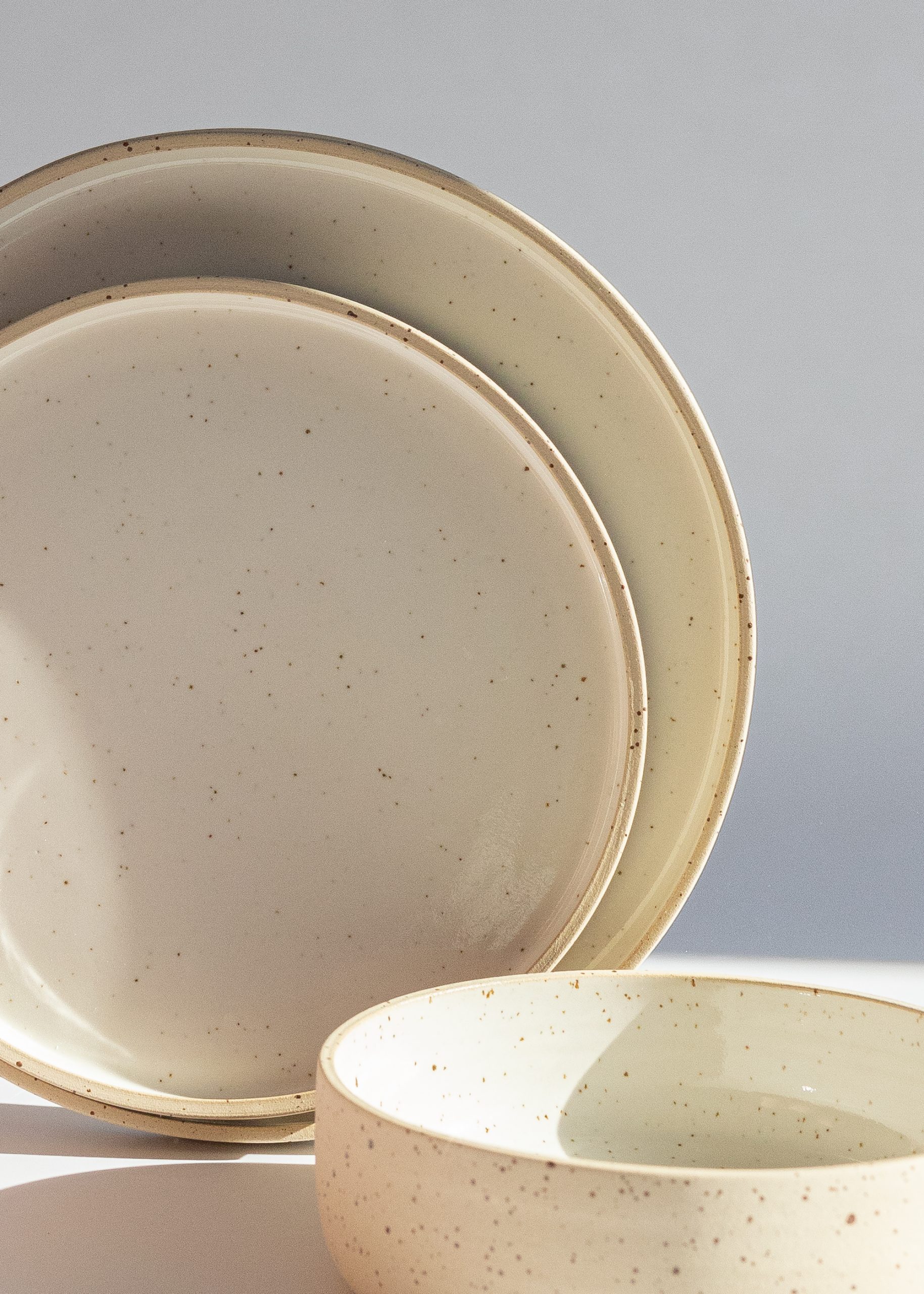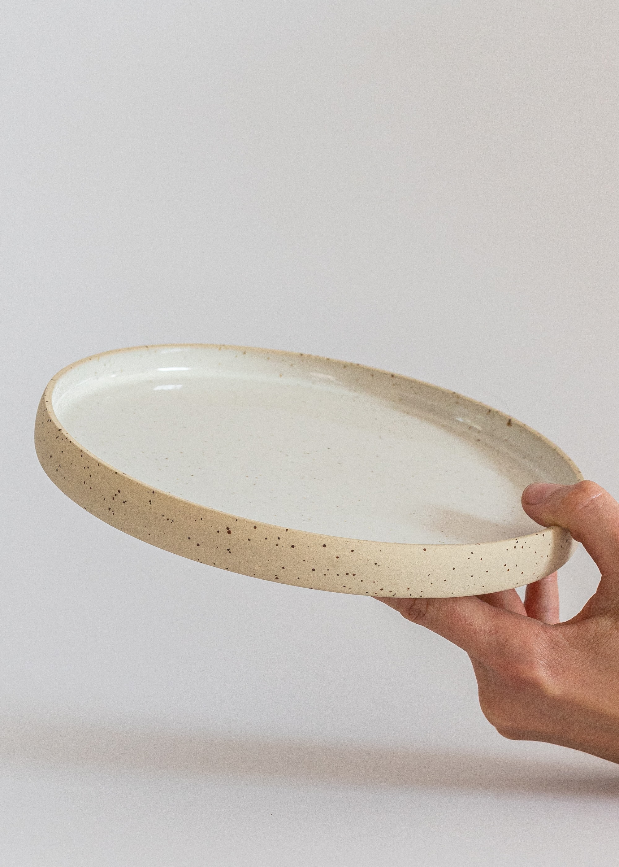 Stoneware plate with a rim made with speckled clay. Inside covered with white glossy glaze.