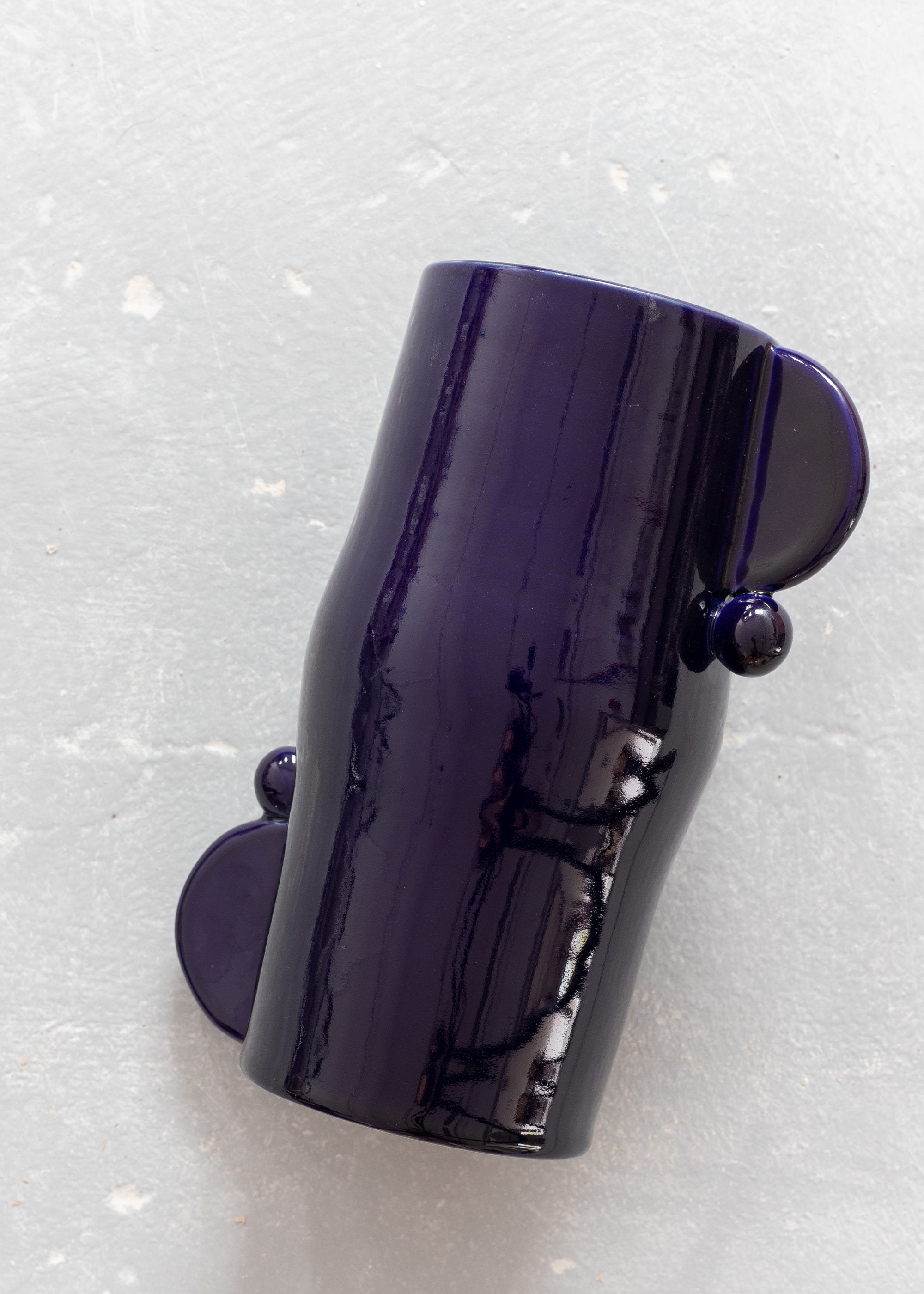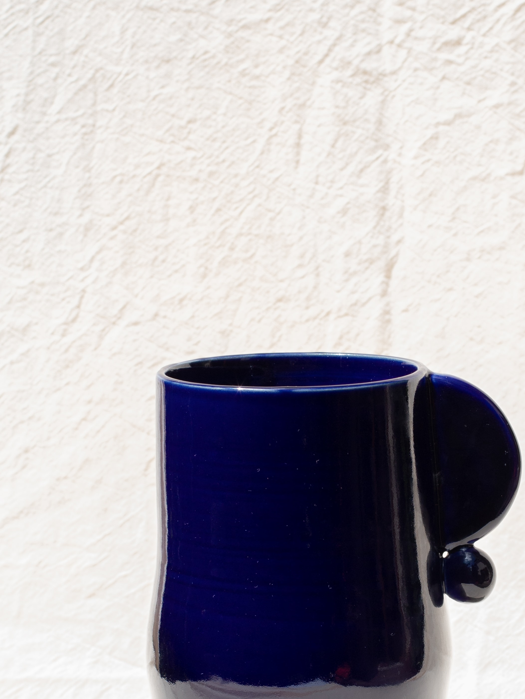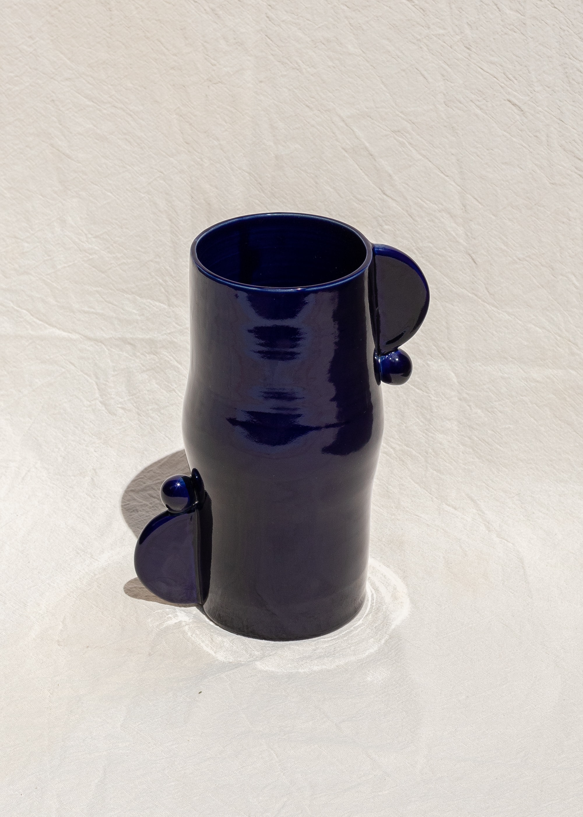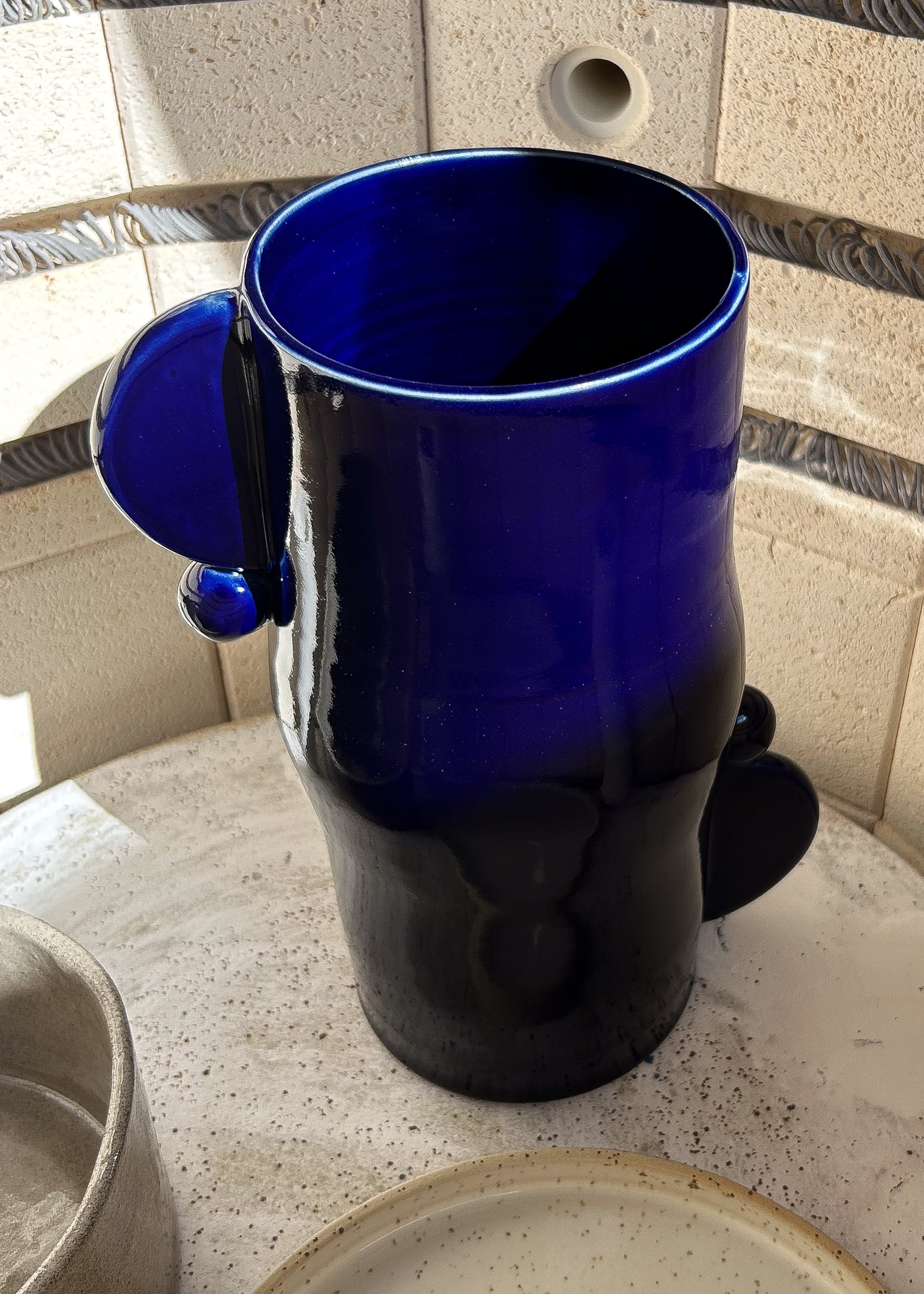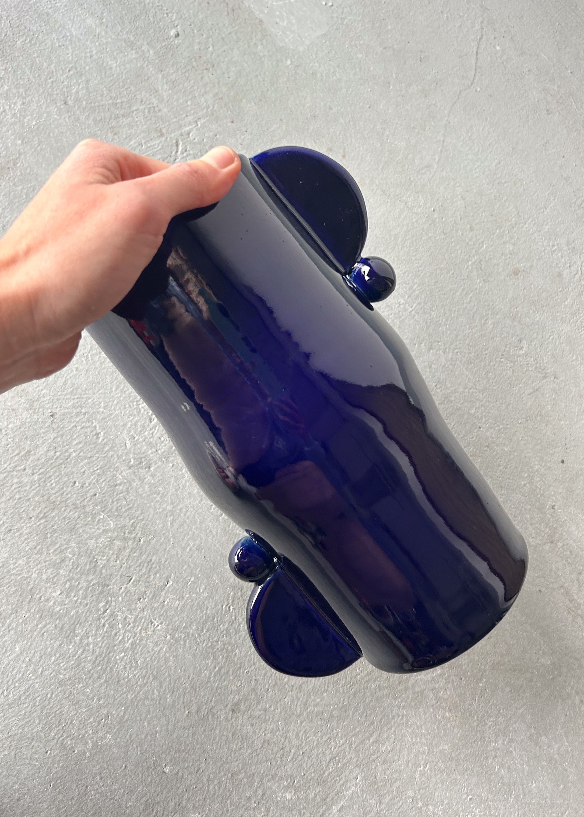 Ceramic vase with geometric details. Deep cobalt glossy glaze.